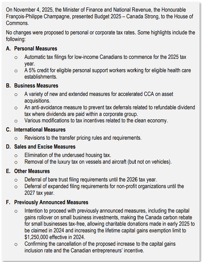 - Budget 2025 also reaffirmed the government’s commitment to move forward as required with other technical amendments to improve the certainty and integrity of the tax system. Budget 2025 reflected the cancellation of the previously proposed increase to the capital gains inclusion rate and the Canadian entrepreneurs’ incentive.